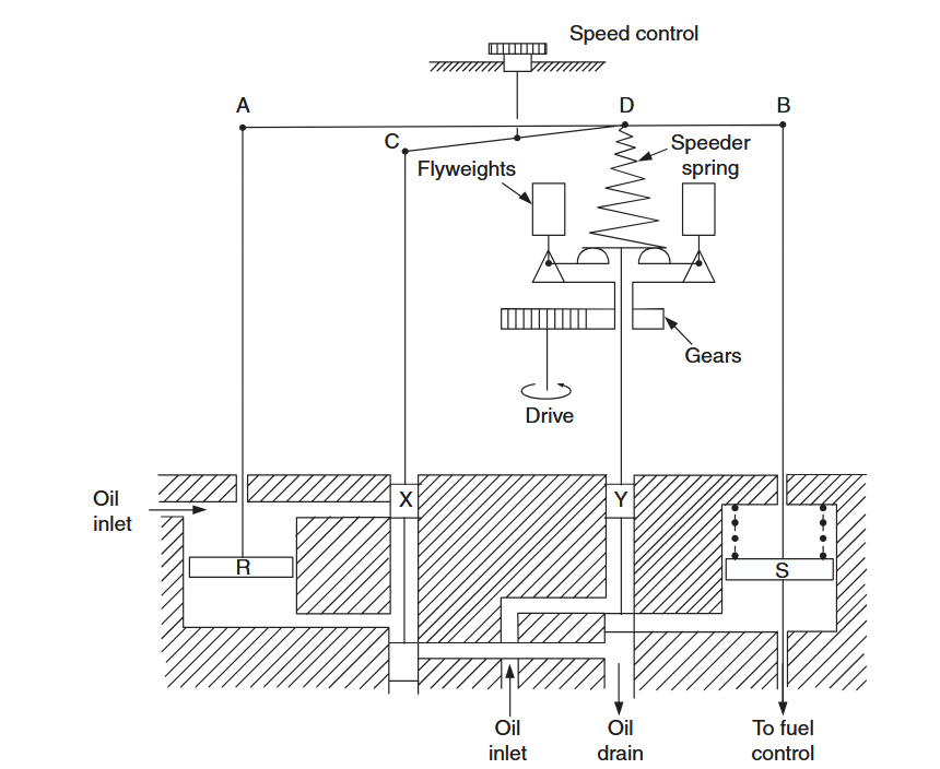 For say an increase in engine load the flyweights move radially inwards and pilot valve